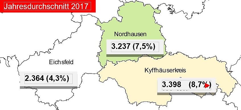 In allen drei Landkreisen des Agenturbezirkes sei die Arbeitslosenquote im letzten Jahr rückläufig gewesen, so Froböse. Im Landkreis Nordhausen sank die Quote von 8,0 auf 7,5 Prozent. Der Kyffhäuserkreis lag 2017 bei 8,5 Prozent im Jahresdurchschnitt. Vor einem Jahr betrug die Quote hier noch fast zehn Prozent. Im Landkreis Eichsfeld beträgt die Jahresquote mit 4,3 erstmals weniger als fünf Prozent.