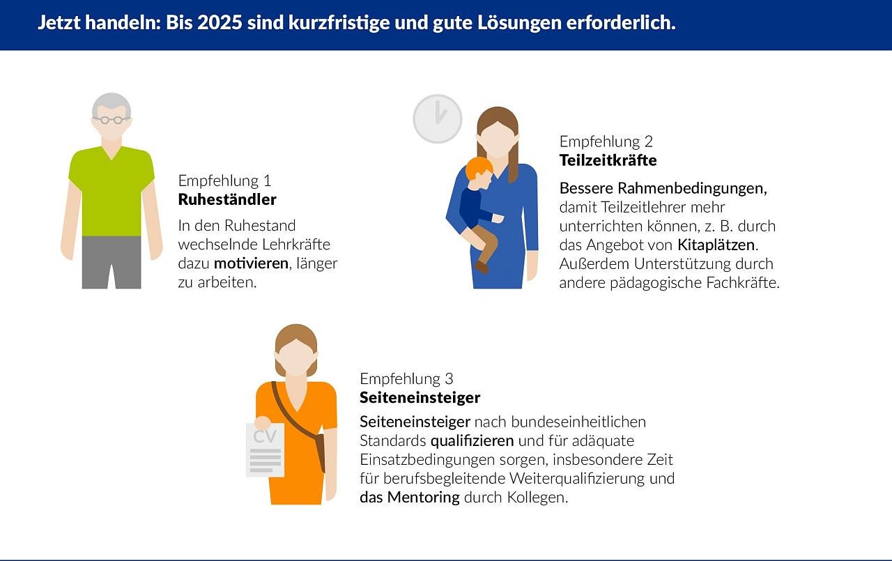Außerdem berücksichtigen sie den Ersatzbedarf durch aus dem Schuldienst ausscheidende Lehrkräfte. Die in der Studie enthaltenen Empfehlungen zu kurzfristig wirksamen Maßnahmen gegen den prognostizierten Lehrermangel wurden vorab in zahlreichen Gesprächen mit Verbändevertretern und Experten ergänzt und plausibilisiert.