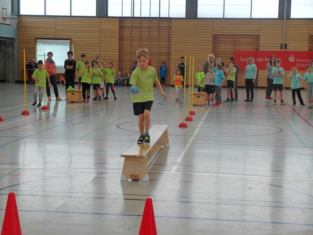 Im 1. Durchgang lag die Grundschule T. Storm aus Heiligenstadt mit 43 Punkten deutlich vor der Montessorischule Beuren mit 34 Punkten. Die Grundschule Siemerode und Gernrode waren im 2. Durchgang mit 36 und 35 Punkten vorn. Bei der Entscheidungsstaffel war vor allem Geschick und Balance gefragt.