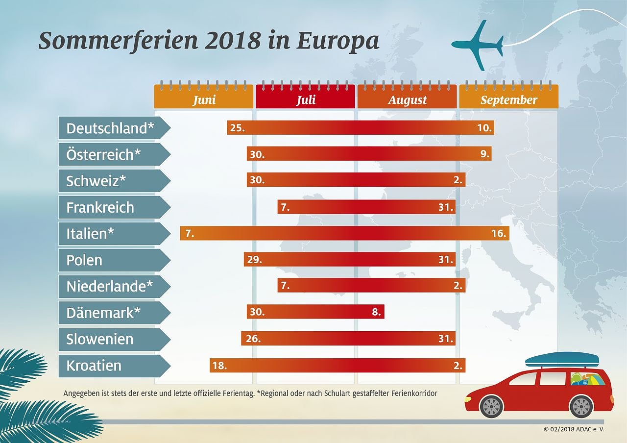 Urlauber, die an einen bestimmten Zeitraum gebunden sind, sollten auch die Ferientermine in den übrigen Ländern in Europa nicht außer Acht lassen. Der ADAC hat hierzu eine Übersicht der Ferientermine in beliebten europäischen Autoreiseländern für den Sommer 2018 zusammengestellt. Wer sich früh über mögliche Reiseziele informiert, ist im Vorteil. Denn viele Reiseveranstalter gewähren Frühbucherrabatte.