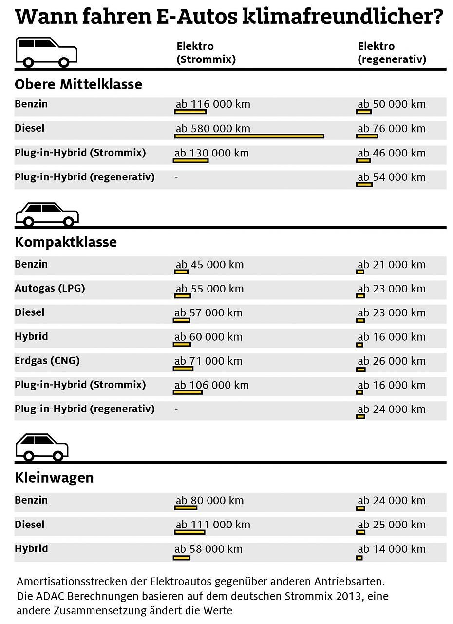 In der Studie hat der ADAC verschiedene Diesel-, Benziner, Erdgas- und Autogas-Pkw sowie Hybrid, Plug-in-Hybride in Kleinwagen, Kompakt- und obere Mittelklasse eingeteilt und bei einer Gesamtlaufleistung von 150.000 Kilometern miteinander verglichen. Dabei hat das E-Fahrzeug in der Kompaktklasse auch bei Nutzung des deutschen Strommixes mit 22,5 Tonnen CO2 die beste Ökobilanz, knapp vor dem Plug-in-Hybrid und dem Hybrid-Modell. Käme der Strom ausschließlich aus erneuerbaren Quellen, wären es nur 10 Tonnen CO2. Am meisten Kohlendioxid kommt vom Benziner mit 30 Tonnen. Damit amortisiert sich das mit dem Strommix geladene E-Auto schon nach etwa 45.000 Kilometern gegenüber dem Benziner und fährt ab dieser Laufleistung bis zur Marke von 150.000 Kilometern umweltfreundlicher.
