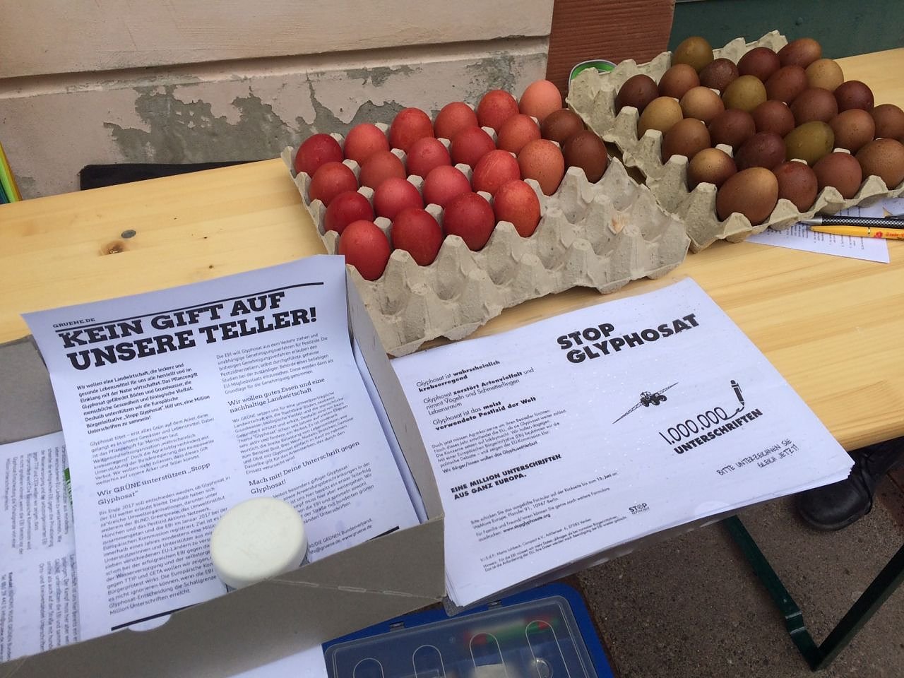 Symbolisch für ein notwendiges Umdenken und ein größeres Bewusstsein von Verbraucherinnen und Verbraucher werden 100 mit Naturfarben gefärbte Öko Eier vom Gut Sambach an die Passantinnen und Passanten verteilt.