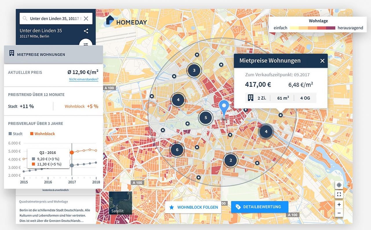 "Über die Zusammenfassung und Kombination aller relevanten Merkmale erreichen wir mit unseren Preisschätzungen ein sehr genaues und detailliertes Abbild der Wirklichkeit”, unterstreicht Wicker. Dadurch schaffen wir eine ganz neue Form der Transparenz bei den Mietpreisen, die für jedermann zugänglich ist und jederzeit abgerufen werden kann.” Bildquelle: www.homeday.de