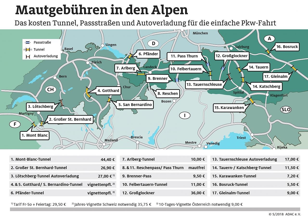 Die Gebührenspanne reicht je nach Länge eines Tunnels beispielsweise von 5,50 Euro für den österreichischen Bosruck-Tunnel (5 509 Meter) bis hin zu 44,40 Euro für den 11,6 Kilometer langen Mont-Blanc-Tunnel zwischen Frankreich und Italien.