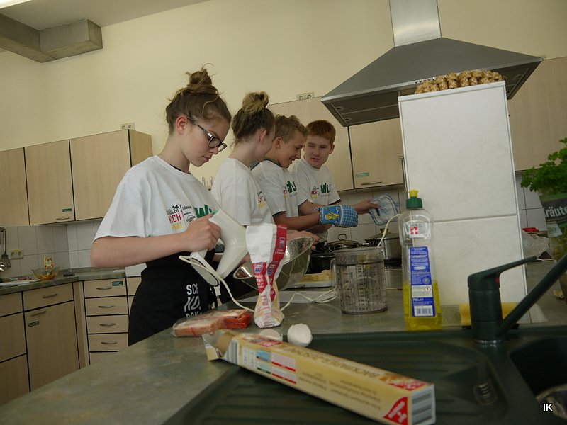 Mike Oertel beobachtete die Schüler beim Kochen, gab ihnen Hinweise und sagte Ihnen zum Aschluss wieviel Punkte sie hätten erreichen können. Bis zum großen Finale in Erfurt sind es noch ein paar Tage, die die Schüler für ihr Kochprojekt mit ihrer Betreuerin Anja Hölscher nun noch nutzen können. Es gibt noch einiges zu tun. Beispielsweise nach chicer typisch Eichsfelder Deko zu suchen. Schließlich heißt das Team Leinefelder Lämmerschwänze und das Menü Buntes aus dem Eichsfeld.