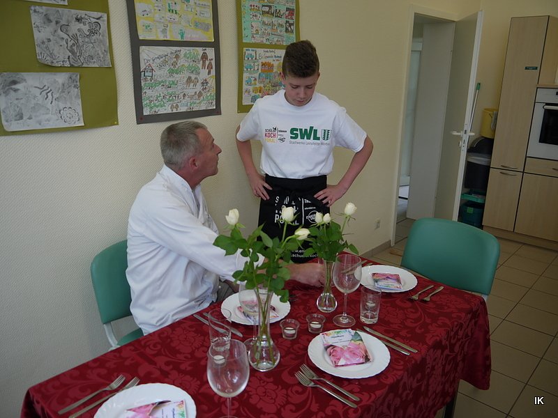 Oliver Splett ist zuständig für die Tischdekoration und den Service, vom Erstellen der Speisekarte bis hin zum Serviettenfalten. Letzteres ist auch mit Anleitung aus dem Internet gar nicht so einfach, es muss auch das passende Material sein. So sind beispielsweise kleine Servietten schlechter zu falten, als große, verriet Mike Oertel. Er freut sich, dass nun eine Leinefelder Schule beim Wettbewerb dabei ist.