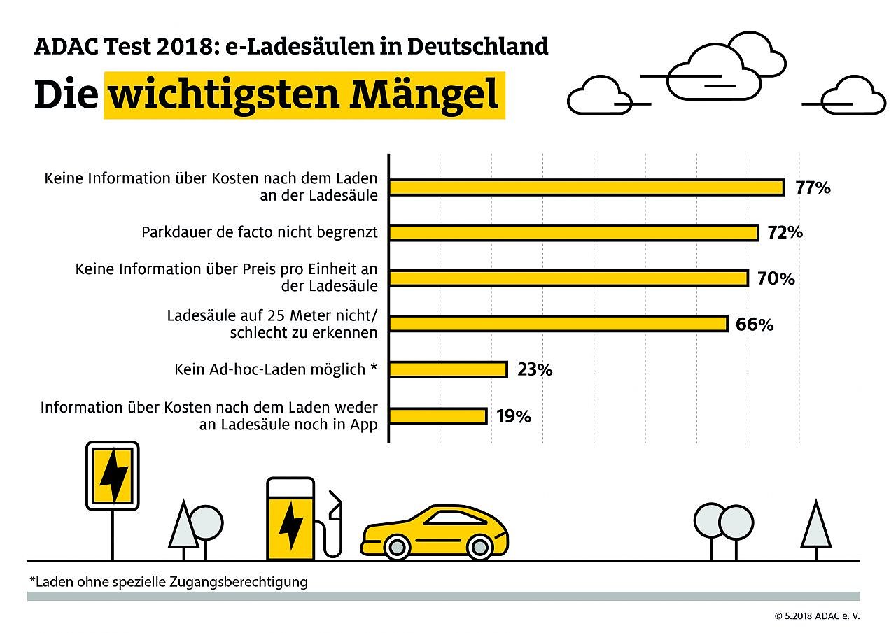 Mängel fanden sich vor allem bei der Preistransparenz. Der Betreiber-Preis pro Einheit war meist nicht auf der Ladesäule angegeben, sondern nur über das Internet oder eine App in Erfahrung zu bringen, ebenso der pro Ladung zu zahlende Betrag. Bei zehn Stationen hatte der Kunde überhaupt keinen Überblick über die angefallenen Kosten und musste auf die Rechnung warten. Das Laden an einer e-Ladesäule muss so komfortabel und bequem sein wie an einer herkömmlichen Zapfsäule. Dazu gehört, dass der Verbraucher vor dem Laden weiß, was der Strom kostet, und nach dem Ladevorgang, wie hoch seine tatsächliche Rechnung ist, so Ulrich Klaus Becker, ADAC Vizepräsident für Verkehr.