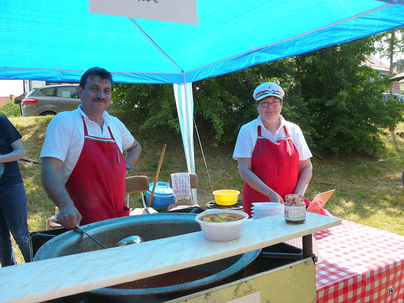 Und wer es deftiger mochte, der war beim Freundkreis Ungarn gut aufgehoben bei echt ungarischem Gulasch, der seit dem frühen Morgen frisch zubereitet wurde oder dem typischen Lagos. Bratwürstchen und Steaks vom Grill waren auch im Angebot. Die Kirmesburschen kamen bei Braten ganz schön ins schwitzen, der Andrang ließ nicht nach und die Sonne auch nicht. Allein 700 Bratwürstchen hatten sie auf den Rost gelegt.
