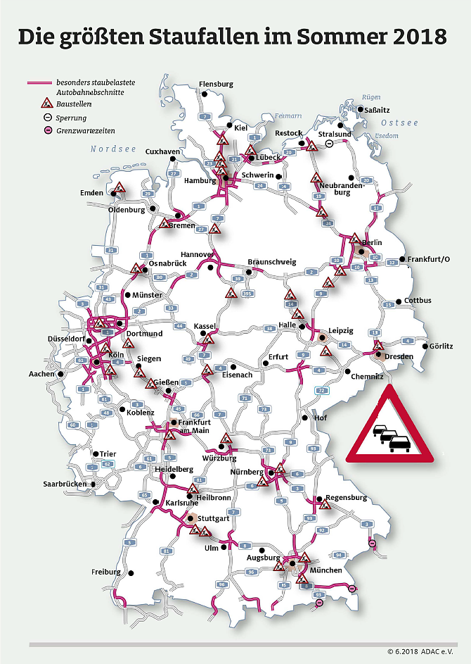 Insgesamt zwölf Wochen dauert die Hauptreisesaison. Spätestens ab Mitte Juli ist mit langen Staus in Richtung der Hauptferiengebiete zu rechnen. Für Thüringen erwartet der ADAC dennoch eine entspannte Verkehrslage: Im Gegensatz zu vielen anderen Bundesländern gibt es auf Thüringens Fernstraßen wenig Baustellen, so Thomas Kramer, Verkehrsexperte des ADAC Hessen-Thüringen. Am wahrscheinlichsten sind Verkehrsstörungen noch am Hermsdorfer Kreuz zu erwarten.