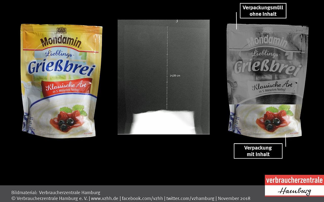- Platz 1 der Untersuchung belegt der »Mondamin Lieblingsgrießbrei Klassische Art« von Unilever. Bei einer Tütenhöhe von 18 Zentimetern sind fast 15 Zentimeter der Packung ohne Inhalt und somit 83 Prozent.