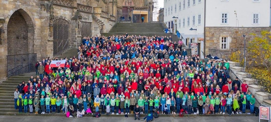 Im Anschluss an den Gottesdienst wurde das erste Gesamtfoto in der Geschichte der Bergschule auf den Dom Treppen aufgenommen. Die einzelnen Jahrgänge trugen verschiedene Farben und eine Drohne kam zum Einsatz, um die knapp 1000 Personen aufs Bild zu bannen.