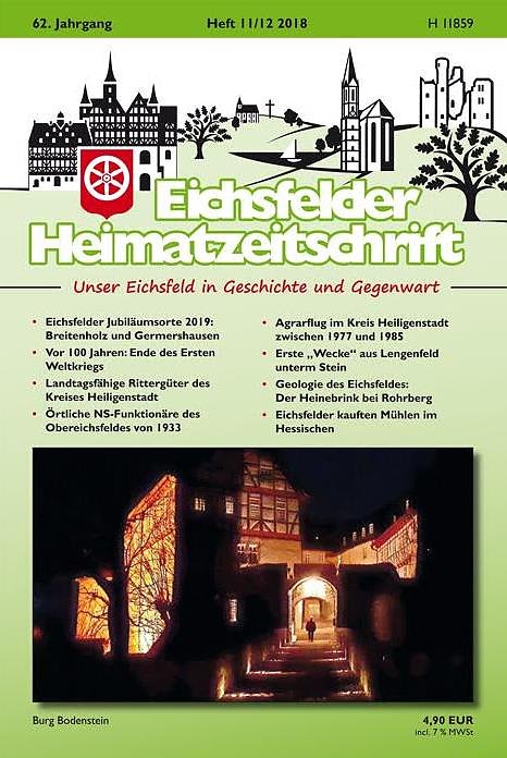Ausführlich bebildert widmet sich Reiner Schmalzl dem Ende des Ersten Weltkrieges vor 100 Jahren, in dem nahezu 4.500 Eichsfelder ihr Leben verloren. Über ehemalige landtagsfähige Rittergüter des Kreises Heiligenstadt berichtet E. Brinkhoff.