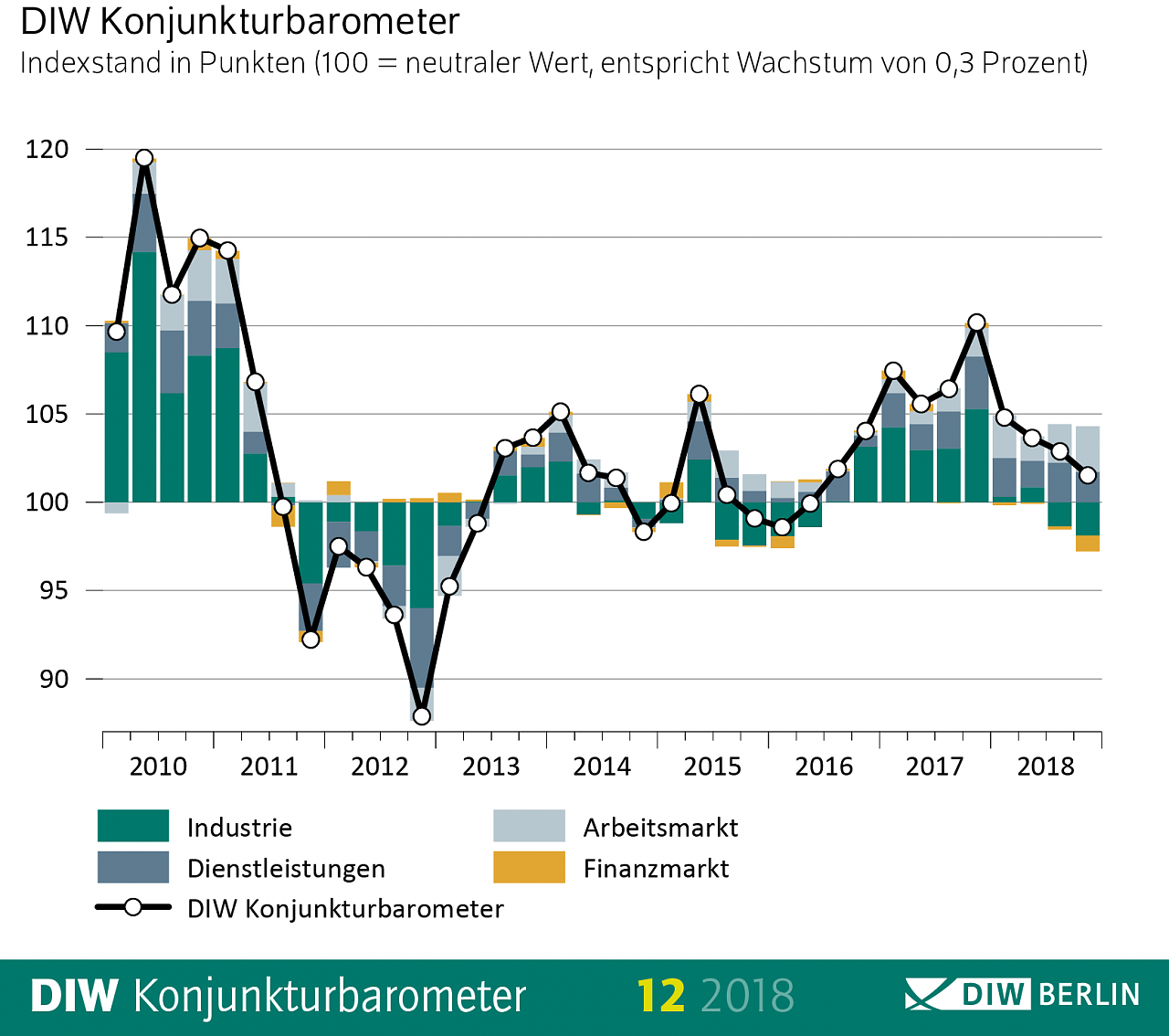 Das Konjunkturbarometer des Deutschen Instituts für Wirtschaftsforschung (DIW Berlin) signalisiert für das Schlussquartal mit einem Indexstand von 101 Punkten ein Wachstumstempo, das trotz einiger Schwächesignale in den vergangenen Monaten in etwa dem langjährigen Durchschnitt entspricht...