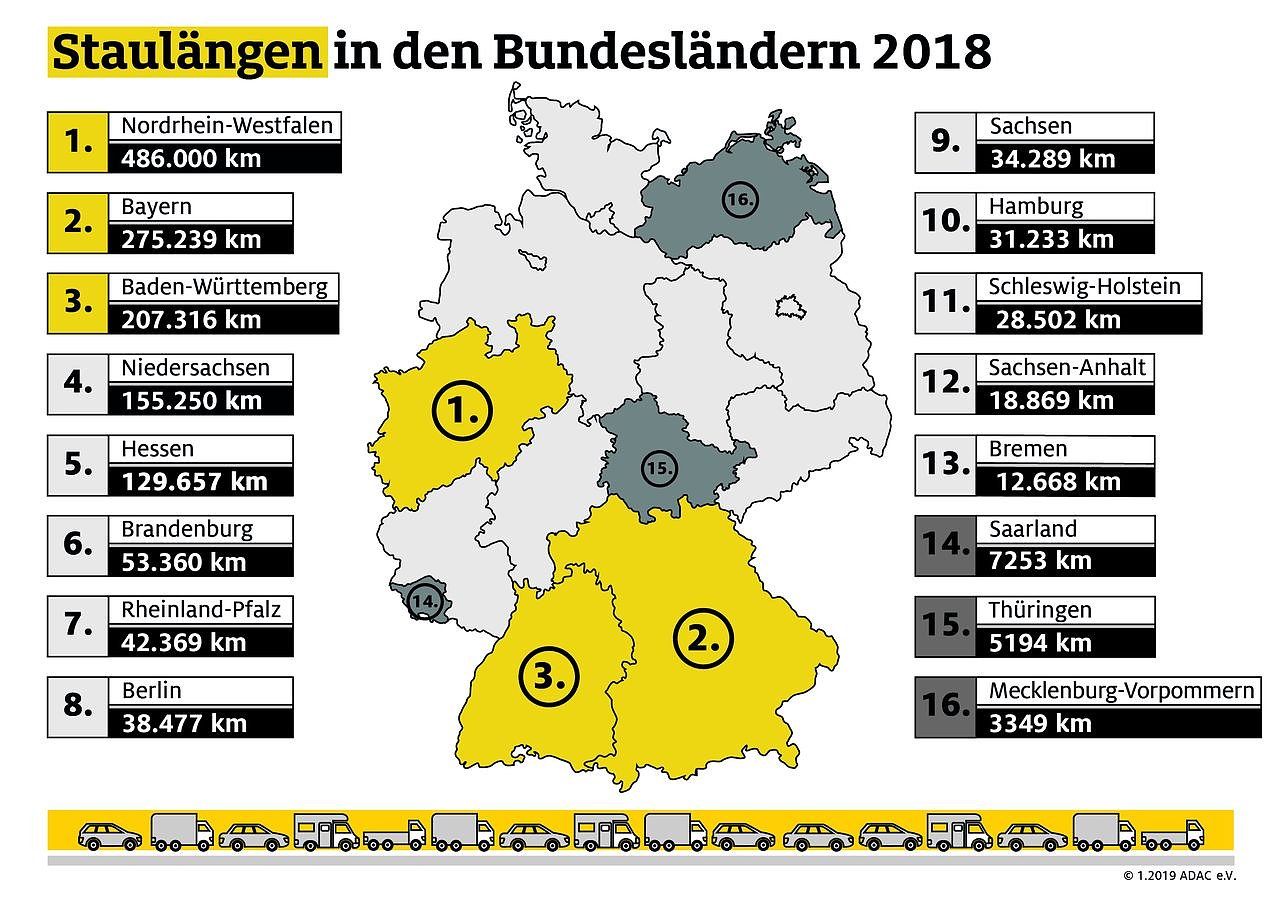 Im Bundesländer-Ranking steht unverändert Nordrhein-Westfalen an der Spitze, 35 Prozent aller Staus entfallen auf Deutschlands bevölkerungsreichstes Bundesland. Auf den Plätzen 2 und 3 erwartungsgemäß wie in den Vorjahren: Bayern (17 Prozent) und Baden-Württemberg (11 Prozent). Damit spielten sich rund zwei Drittel des Staugeschehens in diesen drei Ländern ab.