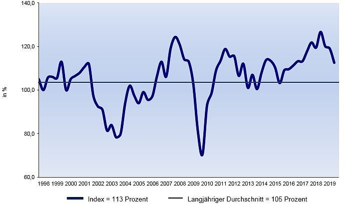 Die Geschäfte in der Industrie laufen gut. Mehr als die Hälfte der Manager beurteilt die aktuelle Situation positiv, über ein Drittel zumindest noch als befriedigend. Über 70 Prozent der Betriebe lastet die Kapazitäten nahezu aus. Dementsprechend wird auch die Ertragslage eingeschätzt. 94 Prozent der Befragten arbeiten mit Gewinn oder wenigstens kostendeckend. Allerdings fällt die Prognose für die nächsten Monate deutlich verhaltener aus als noch im Herbst 2018. Insbesondere die exportorientierten Unternehmen fürchten den negativen Einfluss der außenpolitischen Unwägbarkeiten auf ihre wirtschaftliche Entwicklung.