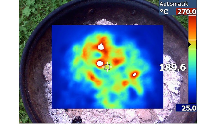 Brandversuch mit einem Kugelgrill: Die thermografische Aufnahme rechts zeigt, dass die Grillasche auch nach vielen Stunden noch gefährlich heiß ist.