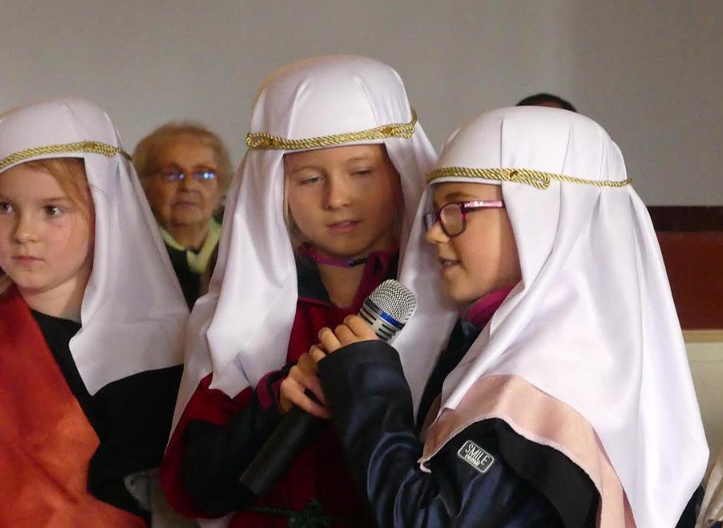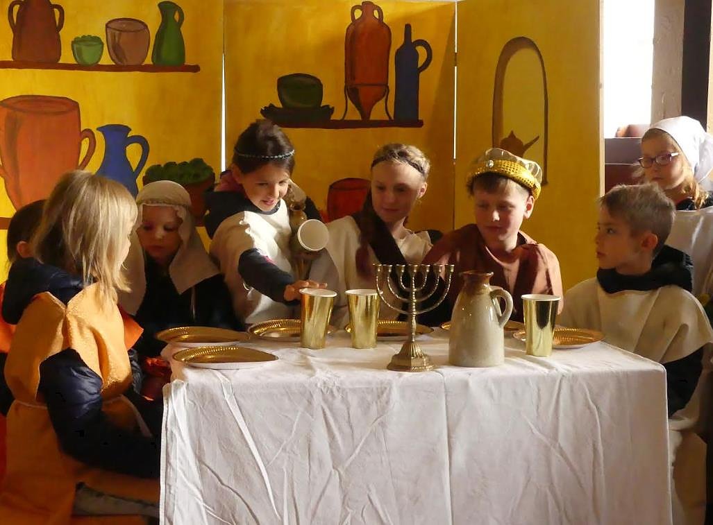 Neben den Kindern der 2. und 3. Klassen traten Malea Zimmer (7. Klasse) als Jesus und Erik Schlichting (5. Klasse) als Zöllner Zachäus mit ihren Soli besonders in Erscheinung. Doch auch alle anderen kamen nicht zu kurz. Da wurde als Schmuggler versucht zu entkommen, als Mitarbeiter des Zachäus gierig Geld kassiert, als Magd fleißig Essen zubereitet und serviert oder als Gemeinde gegen den Besuch bei Zachäus protestiert. Immer unterlegt mit schwungvollen modernen Melodien, die der Chor zum Klingen brachte.