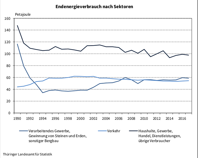 Der Endenergieverbrauch im Jahr 2017 betrug in Thüringen insgesamt 210,9 Petajoule (PJ). Das sind 0,7 Prozent weniger als im Jahr zuvor. Die größte Verbrauchergruppe ist der Sektor Haushalte ein- schließlich Gewerbe, Handel und Dienstleistungen, auch Kleinverbraucher genannt. Hier wurden 97,6 Petajoule an Energieträgern verbraucht. Das waren 1,2 Prozent weniger als im Jahr 2016. Der Anteil des Sektors Haushalte und Kleinverbraucher am gesamten Energieverbrauch betrug 46,3 Prozent.