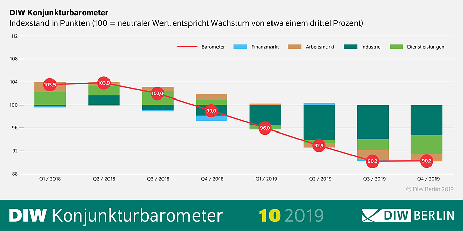 Die anhaltende Schwäche der Industrie dürfte zuletzt immer mehr auch auf die Dienstleistungsbranchen ausgestrahlt haben, sagt DIW-Konjunkturchef Claus Michelsen. Im verarbeitenden Gewerbe ist die Beschäftigung sogar gesunken, das gab es schon lange nicht mehr. Allerdings haben sich die Geschäftserwartungen der Unternehmen zuletzt wieder stabilisiert. Ein Abrutschen in eine tiefere Rezession ist derzeit also weniger wahrscheinlich geworden, so Michelsen.