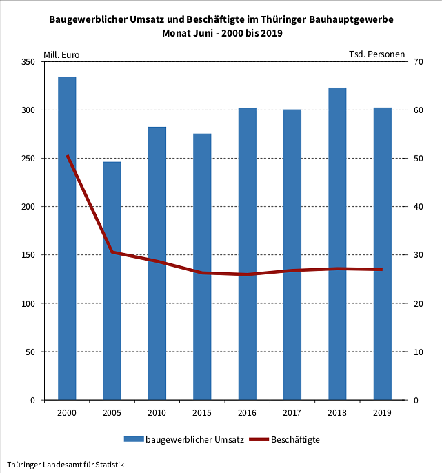 wurden im thüringischen Bauhauptgewerbe 11 210 Euro je Beschäftigten erwirtschaftet und damit 5,8 Prozent weniger als im Vorjahresmonat.