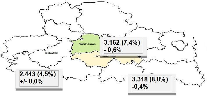 Der Kyffhäuserkreis hatte eine Arbeitslosenquote von 8,8 Prozent und lag damit deutlich unter den 9,2 Prozent des Vorjahres. Der Landkreis, mit stark ländlicher Ausprägung, hat im Winter stärkere saisonale Auswirkungen als manch andere Region in Thüringen. Erst mit Beginn des Frühjahres wird hier die Nachfrage nach Personal wieder steigen. 3.318 Jobsuchende waren im letzten Monat gemeldet, knapp 240 weniger als im Januar des vergangenen Jahres. Rund 1.900 Menschen werden vom Jobcenter des Kyffhäuserkreises betreut.