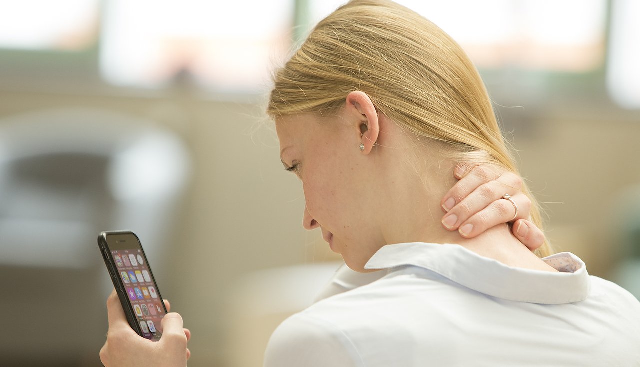 Im stressigen Alltag neigt man oft dazu, Fehlhaltungen einzunehmen ohne es zu bemerken – so auch bei der Nutzung des Smartphones. Versuchen Sie daher beim nächsten Mal darauf zu achten weniger den Kopf zu neigen, sondern die Augen zu senken. So minimieren sie das Gewicht, das auf ihre Halswirbelsäule wirkt und verhindern eine Überlastung.