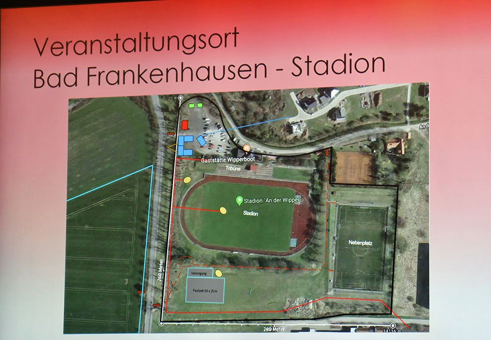 Die beiden Hauptwettkampforte werden der Schlossplatz im Zentrum Bad Frankenhausens sein und als zweiter Wettkampfort wird das Stadion an der Wipper sein, bei dem ein angrenzendes Feld als Parkplatz dienen wird. Frühere Pläne, Wettkämpfe auf dem Kyffhäuser im Bereich des Denkmalsareals durchzuführen sind damit verworfen.