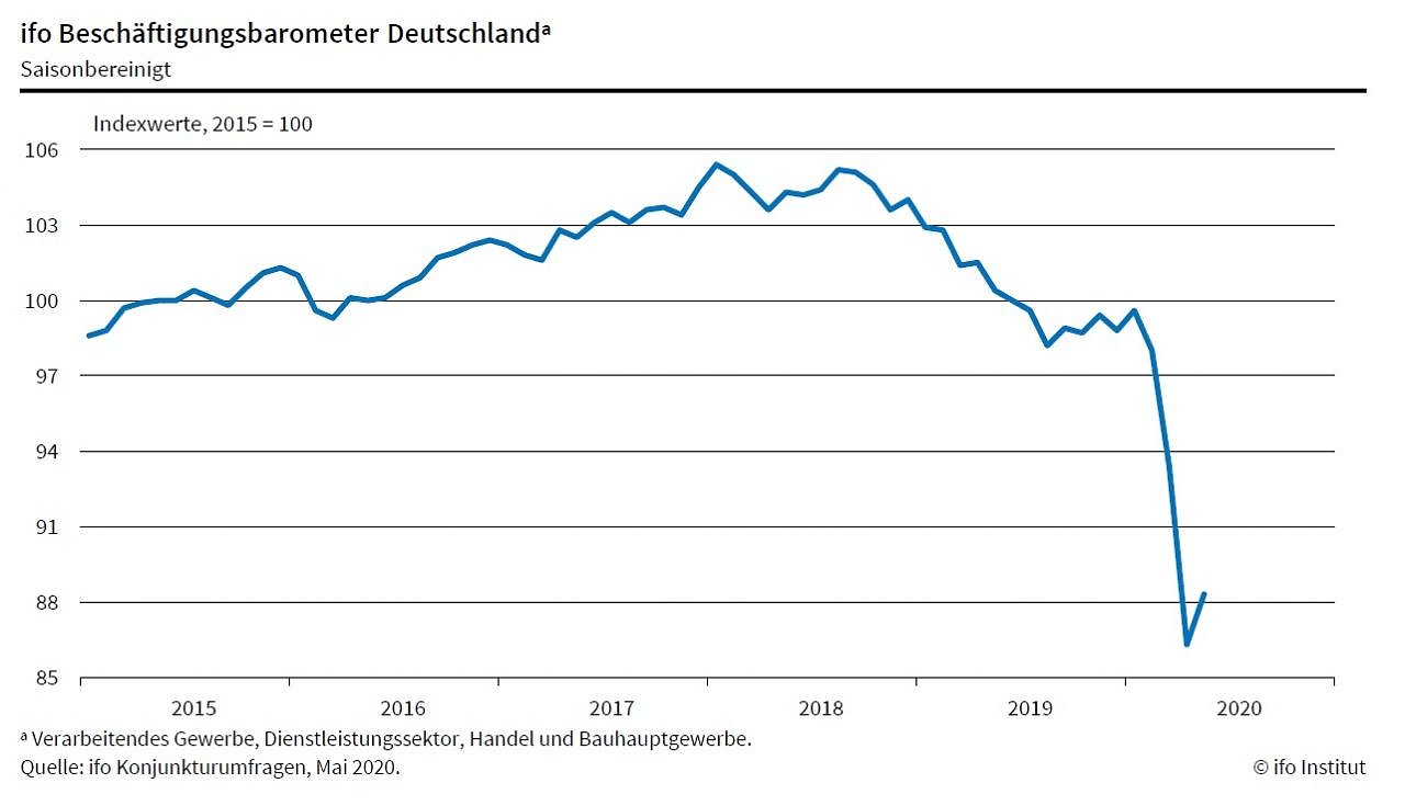 Die deutschen Unternehmen gehen weiter von sinkenden Mitarbeiterzahlen aus. Das ifo Beschäftigungsbarometer ist gleichwohl im Mai auf 88,3 Punkte gestiegen, von 86,3 Punkten im April. Trotz dieses Anstiegs wird die Zahl der Entlassungen die der Einstellungen übersteigen. Die Arbeitslosigkeit in Deutschland wird somit zunehmen...