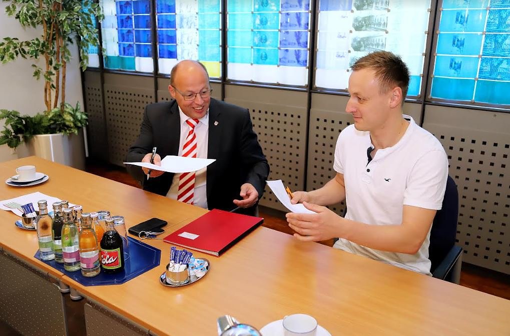 Eine Dienstvereinbarung zur Einführung von Kurzarbeit aufgrund der COVID-19-Pandemie unterzeichneten Marko Grosa, Bürgermeister der Stadt Leinefelde-Worbis, und Personalratsvorsitzender Joachim Kaufhold am vergangenen Freitag (29.5.2020).