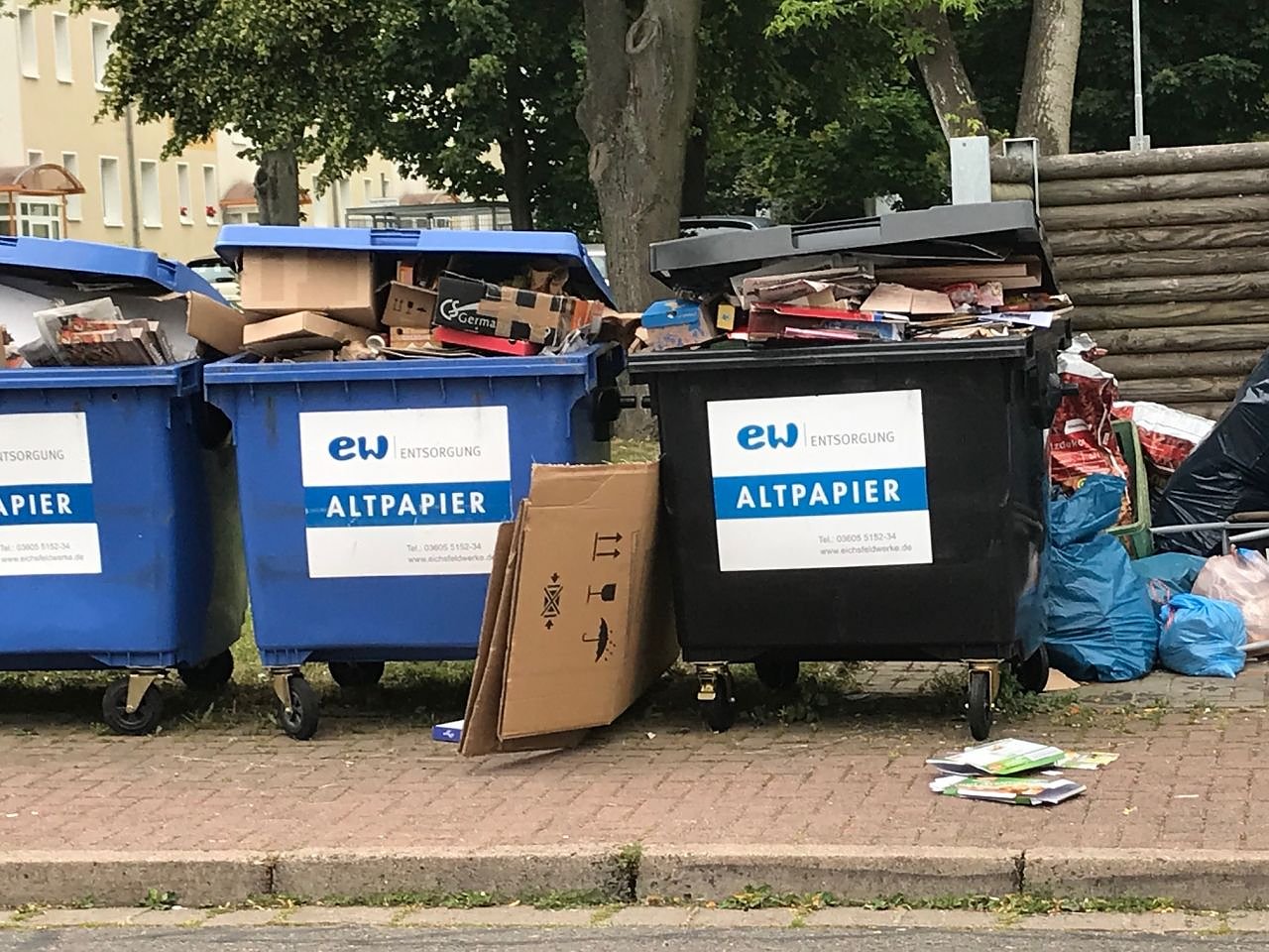 Das Thema ist nicht neu. Die Eichsfeld Werke wollen den Standort nicht aufgeben. Doch man fragt sich, warum diese Tonnen hier überhaupt noch stehen. Alle Wohngebäude ringsum haben ihre eigenen Papier- und Gelbe Säcke-Container.