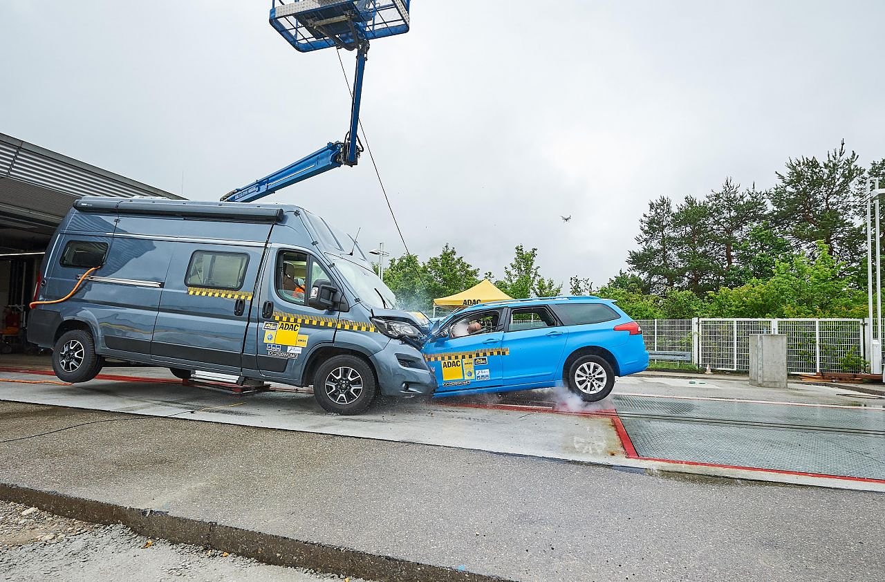 Beim Crash-Versuch stößt ein Wohnmobil frontal bei 56 km/h gegen einen Kombi. Dabei sind – so das Ergebnis des Crashs – die Knautschzonen beider Fahrzeuge überfordert. Die Front des Wohnmobils ist nicht optimal gestaltet, um die Energie des Aufpralls abzubauen und die Knautschzone des Kombi ist dem voll beladen gut doppelt so schweren Wohnmobil (3,5 Tonnen) alleine nicht gewachsen. In der Folge werden die Fahrgastzellen beider Fahrzeuge beschädigt und die Pedale weit in den Fußraum geschoben, so dass für die Fahrer beider Fahrzeuge ein sehr hohes Verletzungsrisiko besteht. Der ADAC folgert daraus, dass Hersteller von Wohnmobilen, egal ob auf Basis eines Pkw oder eines Nutzfahrzeugs, die Fahrzeugfront so konzipieren müssen, dass die Energie des Aufpralls in der Knautschzone abgebaut wird, die Fahrgastzelle muss als Überlebensraum stabil bleiben, damit die Insassen bestmöglich geschützt sind.