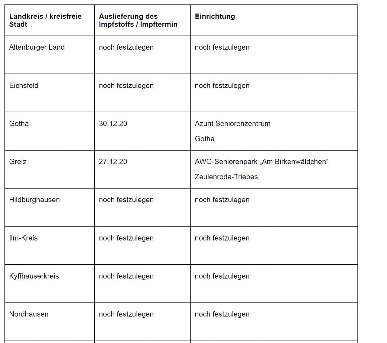 - geplante Impfungen durch mobile Impfteams am 05.01.2021: insgesamt ca. 200 Personen in einem Pflegeheim im Unstrut-Hainich-Kreis und einem Pflegeheim in Weimar