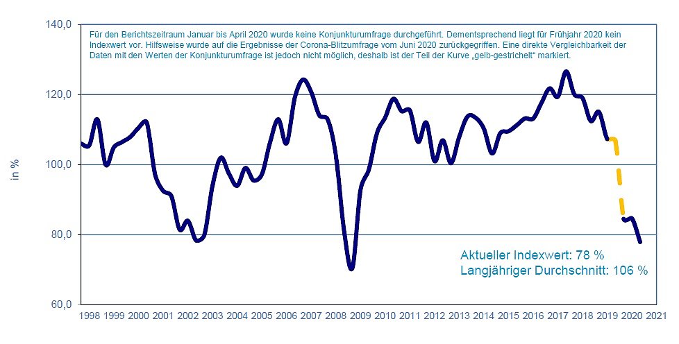 Die Corona-Pandemie hat die Wirtschaft weiter fest im Griff und lässt den Konjunkturklimaindex auf 78 von 200 möglichen Prozentpunkten fallen – den niedrigsten Wert seit der Finanzmarktkrise 2009.