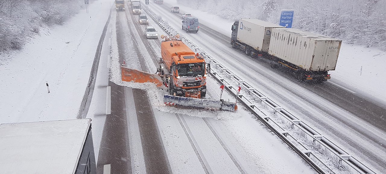 Bei starkem Schneefall fahren mehrere Fahrzeuge als Räumstaffel in die jeweiligen Betreuungsbereiche. Dabei wird zunächst der Schnee beräumt, ehe mit Taumittel die Glättebildung abgewehrt wird. Dabei kommt es entscheidend auf die Verkehrsteilnehmerinnen und -teilnehmer an. Die Taumittel entfalten ihre abtauende und trocknende Wirkung am besten, wenn der nachfolgende Verkehr konstant darüber rollt. Die beste Unterstützung für uns sind umsichtige Fahrerinnen und Fahrer, die ihre Geschwindigkeit anpassen und nicht versuchen, unsere Räumfahrzeuge zu überholen, erläutert Thomas Müller. Winterdienst funktioniert am besten im Zusammenspiel aller Akteure auf der Autobahn. Zum einen sollte die Fahrweise an die äußeren Einflüsse angepasst werden, speziell bei Glätte und Blitzeis. Zum anderen verringert eine angepasste Bereifung die Unfallgefahr. Deshalb gilt nicht nur auf der Autobahn: keine Sommerreifen in der Winterzeit.