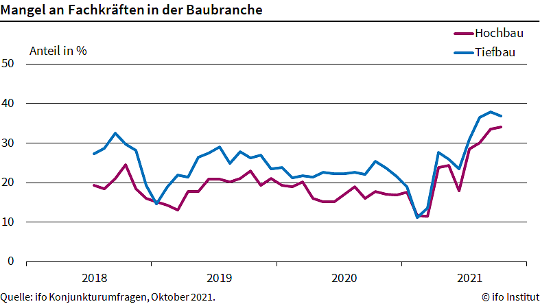 Im Tiefbau ging die Zahl zurück auf 36,8 Prozent, nach 37,9 Prozent im Vormonat. Der Fachkräftemangel ist ein zentrales Problem für die Bauwirtschaft. Mehr als jedes dritte Unternehmen findet nicht genügend Personal.