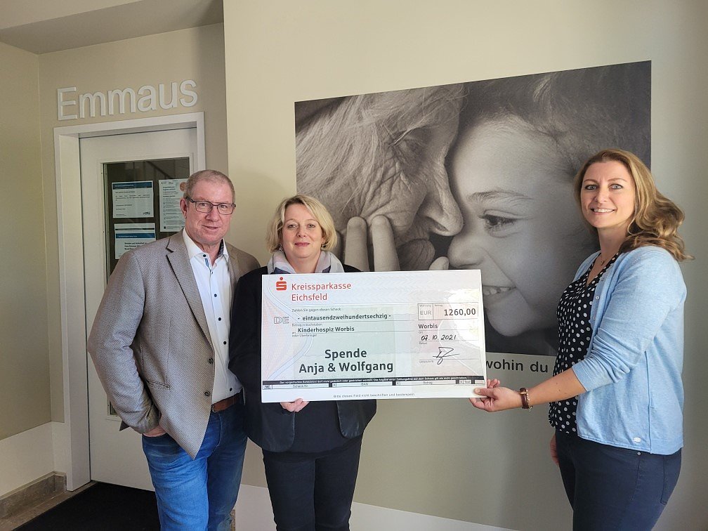 Die Aufmerksamkeit aller hospizlichen und palliativen Belange sollten auf nationaler aber auch auf internationaler Ebene erhöht werden. So fand auch im diesem Jahr am zweiten Samstag im Oktober der Welthospiztag statt. Der Deutsche Hospiz- und Palliativverband rief im Jahr 2000 ebenfalls den Deutschen Hospiztag ins Leben. Er wird heute in enger Anbindung an den Internationalen Welthospiztag jährlich am 14. Oktober begangen. Vor diesem Hintergrund erhielt das Kinderhospiz Haus Emmaus der EK Pflege eine besondere Spende. Anja und Wolfgang Fiedler haben sich nach 20 Jahren das Ja Wort zur Ehe gegeben und damit verbunden eine ganz besondere Spende übergeben. Aufmerksam wurden die beiden auf die Thematik der deutschen Hospizdienste und die Abhängigkeit auf Spendengelder durch eine Reportage. Der Wunsch zu helfen wurde durch zahlreiche Gespräche mit Freunden und Bekannten gefestigt. Da die Hochzeit vor der Tür stand, kam ihm die Idee zu helfen und somit die Hälfte seines Anteils an Geld- und Gutscheingeschenken an einen Kinderhospizdienst zu spenden. Er besprach diese Idee mit seiner zukünftigen Frau und erhielt schnell ihre Unterstützung für das Vorhaben. Gemeinsam sammelten sie Informationen und recherchierten die Standorte einer solchen Einrichtung in ihrer Region. Schnell wurden sie auf das Haus Emmaus in Worbis aufmerksam und nahmen so Anfang August Kontakt auf.