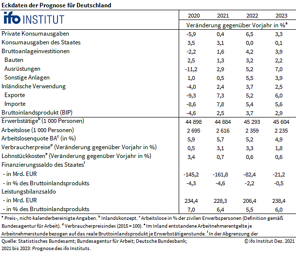 Im laufenden Quartal dürfte das Bruttoinlandsprodukt um 0,5 Prozent gegenüber dem Vorquartal schrumpfen und am Jahresbeginn 2022 nur stagnieren. Im Sommerhalbjahr 2022 wird mit dem Abebben der Coronawelle und dem allmählichen Ende der Lieferengpässe eine kräftige Erholung einsetzen, sagt Wollmershäuser. Die gesamtwirtschaftliche Produktion dürfte mit Raten von 2,3 sowie 1,8 Prozent im zweiten und dritten Quartal 2022 deutlich zulegen und sich dann langsam auf durchschnittliche Zuwächse einschwenken.