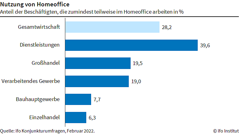 In der Bekleidungsindustrie fiel die Homeoffice-Quote deutlich von 37,9 auf 33,8 Prozent. Auch in der Chemiebranche fiel der Anteil von 21,7 auf 18,8 Prozent. Bei den Rundfunkveranstaltern und Filmproduzenten, Kinos und Tonstudios stieg die Quote deutlich. Auch in der Werbung und Marktforschung blieb der Anteil hoch: Er stieg auf 65,3 Prozent, nach 60,3 Prozent im Januar. Bei den Reisebüros und -veranstaltern fiel die Quote von 45,0 auf 38,8 Prozent.