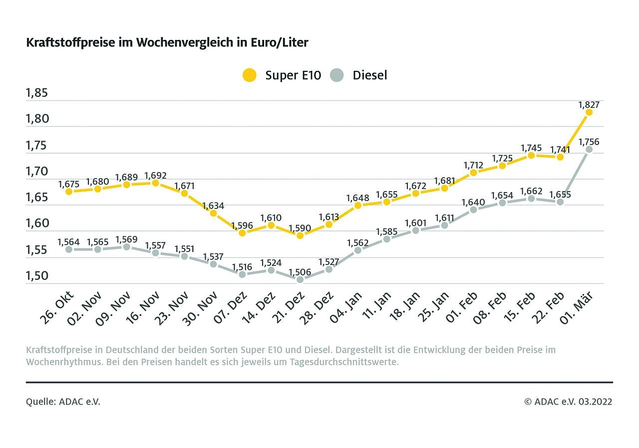 So kostet ein Liter Super E10 im bundesweiten Mittel 1,827 Euro. Das entspricht einem Anstieg von 8,6 Cent im Vergleich zur vergangenen Woche. Noch größer fällt die Wochendifferenz beim Diesel aus: Mit einem Preis von 1,756 Euro kostet ein Liter hier im Bundesschnitt 10,1 Cent mehr.
