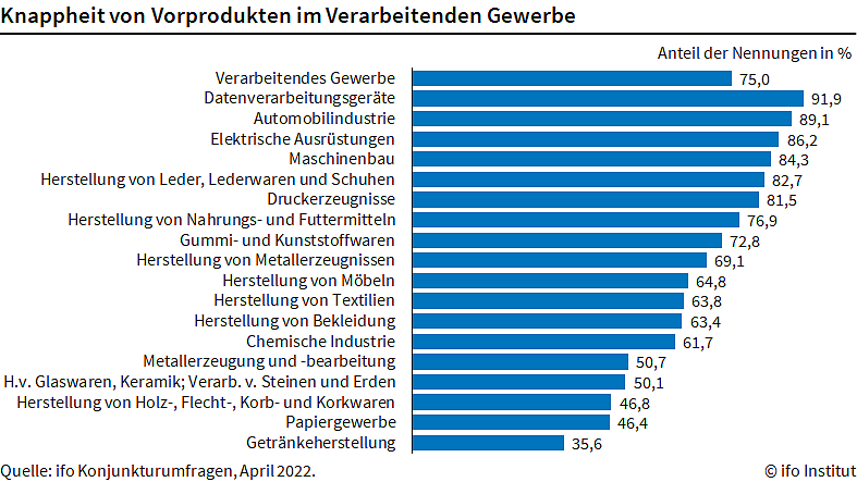 Die Hersteller von Datenverarbeitungsgeräten sind mit 91,9 Prozent am stärksten betroffen vom Materialmangel. Auch in der Autoindustrie ist der Anteil mit 89,1 Prozent sehr hoch. Bei den Herstellern von Nahrungsmitteln ist der Anteil auf rund drei Viertel gestiegen. In der Chemischen Industrie ist der Anteil hingegen auf 61,7 Prozent gesunken, von 70,5 im März. „Im Moment gibt es keine Anzeichen, dass es in den kommenden Monaten zu einer substantiellen Entlastung kommt“, ergänzt Wohlrabe.
