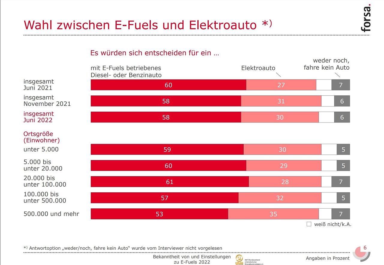 Das renommierte Meinungsforschungsinstitut forsa hat Ende Juni 2022 die Einstellung der Bevölkerung in Deutschland zu synthetischen Kraftstoffen (E-Fuels), zur Elektromobilität sowie zu weiteren verkehrspolitischen Themen abgefragt. Die repräsentativen Ergebnisse zeigen, dass ein EU-Neuzulassungsverbot für Benziner und Diesel ab 2035 keine Mehrheit bei den Menschen findet...