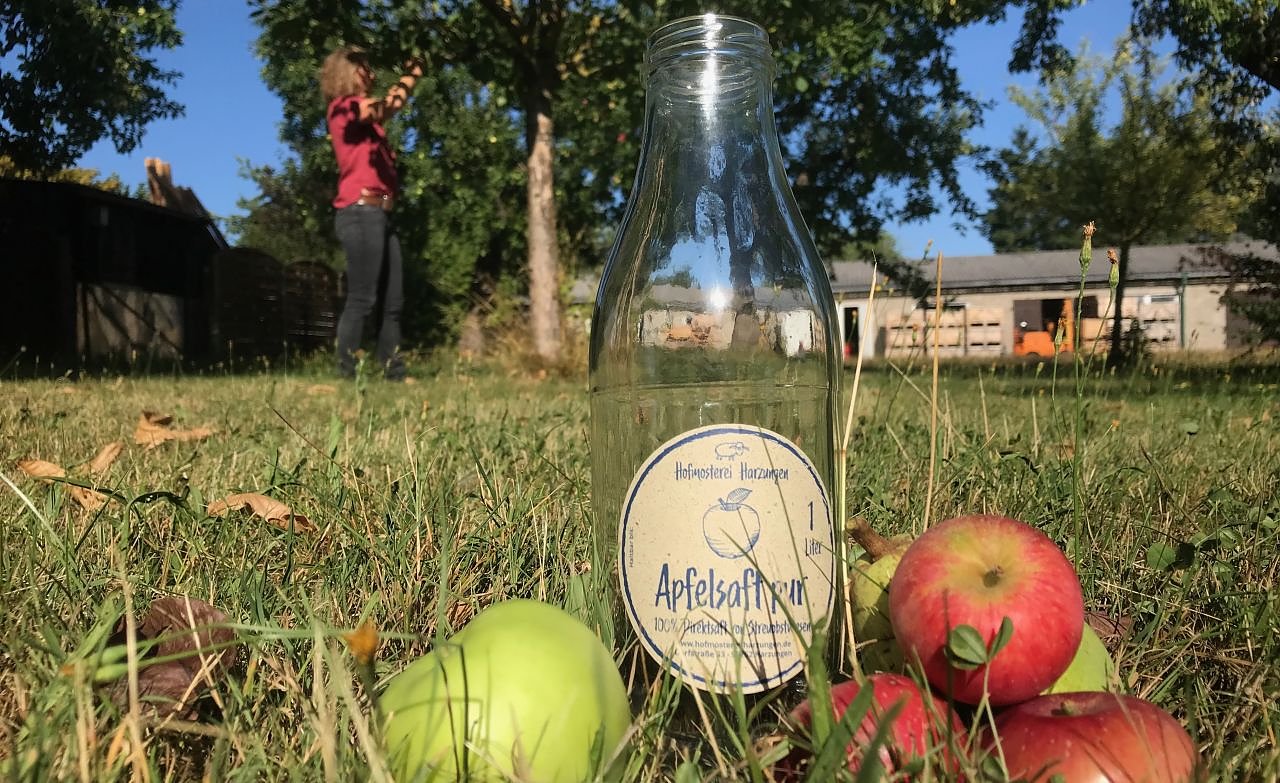 Seit über zehn Jahren gehören Obstbäume zum Leben von Alexander Ibe und Kathleen Hahnemann. In Harzungen haben sie sich eine kleine Mosterei aufgebaut, versaften was sie selber auf mehreren Streuobstwiesen in der Region anbauen und bieten seit ein paar Jahren auch Lohnmosterei an.