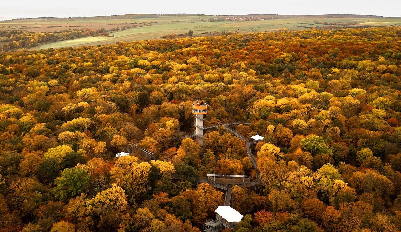 Wenn der Herbst Einzug hält, verwandelt sich der Nationalpark Hainich in ein farbenfrohes Blättermeer. Von Grün über gelb bis rot leuchten die Blätter der Laubbäume. Besonders schön zu beobachten vom Baumlkronenpfad bei Bad Langensalza...