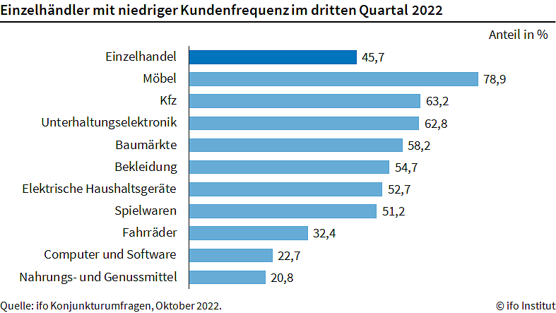 Wegen der hohen Inflationsraten können sich gerade einkommensschwache Menschen weniger leisten und sind zurückhaltend mit Einkäufen, ergänzt Wohlrabe. Besonders betroffen waren die Möbelhäuser – 80 Prozent der befragten Unternehmen berichteten davon, dass weniger Kunden kamen.