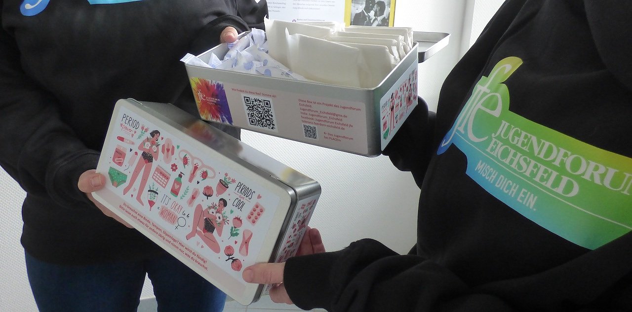 Das wollen die Mitglieder des Jugendforum Eichsfeld ändern. Mit der Menstruations-Box verfolgen die Jugendlichen zwei Ziele: Erstens die Normalisierung und Enttabuisierung der Menstruation, und zweitens eine Grundversorgung mit Tampons und Binden, die sich vielleicht nicht alle Schülerinnen leisten können. Diese sogenannte Periodenarmut gibt es auch in Deutschland, sie betrifft vor allem junge Frauen. In einigen Ländern wie Schottland, Neuseeland oder Frankreich gibt es bereits kostenlose Periodenprodukte an Schulen oder Universitäten. In Deutschland existieren Pilotprojekte zum Beispiel an der Hochschule Merseburg und in Dresden. Nun gehört auch das Eichsfeld zu den Vorreitern!