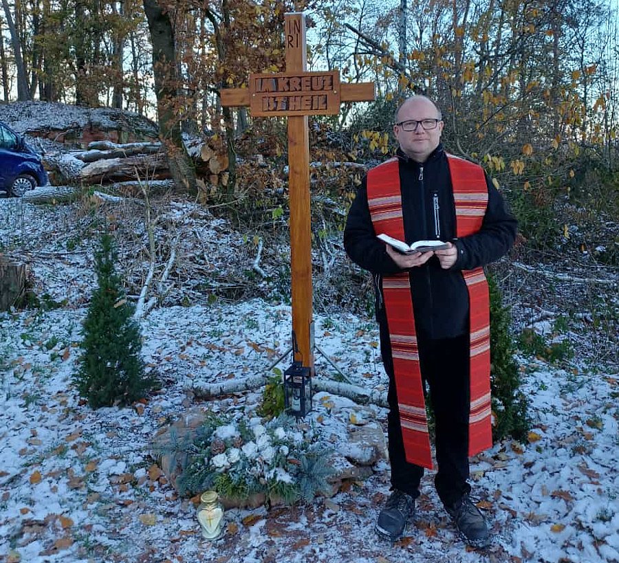 Autor: enOrtspfarrer Tobias Reinhold erinnerte in seiner Ansprache zum einjährigen Jubiläum der Einsegnung daran, dass es gerade heute Mut und Kraft kostet, sich zum Kreuz zu bekennen. Aktuelle Beispiele zeigten, wie die Gesellschaft sich nicht dem Kreuz stellt oder gar das Kreuz entfernt. So ließ das Auswärtige Amt vor dem G7-Gipfel im historischen Rathaus von Münster ein Kreuz abhängen.