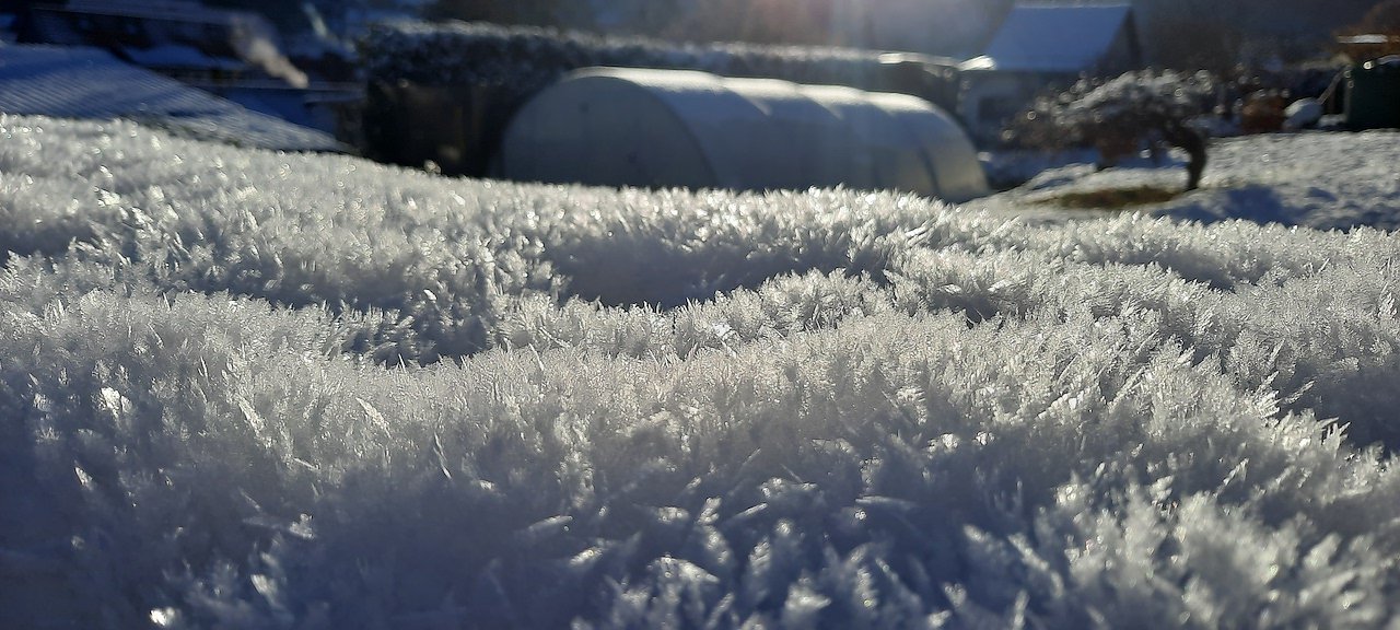 Herr Nadolny schrieb uns folgenden Text zum Foto: Eine schnelle Handyaufnahme. Schnee auf einer Bleicheröder Hecke, überfroren und vom Wind modelliert.