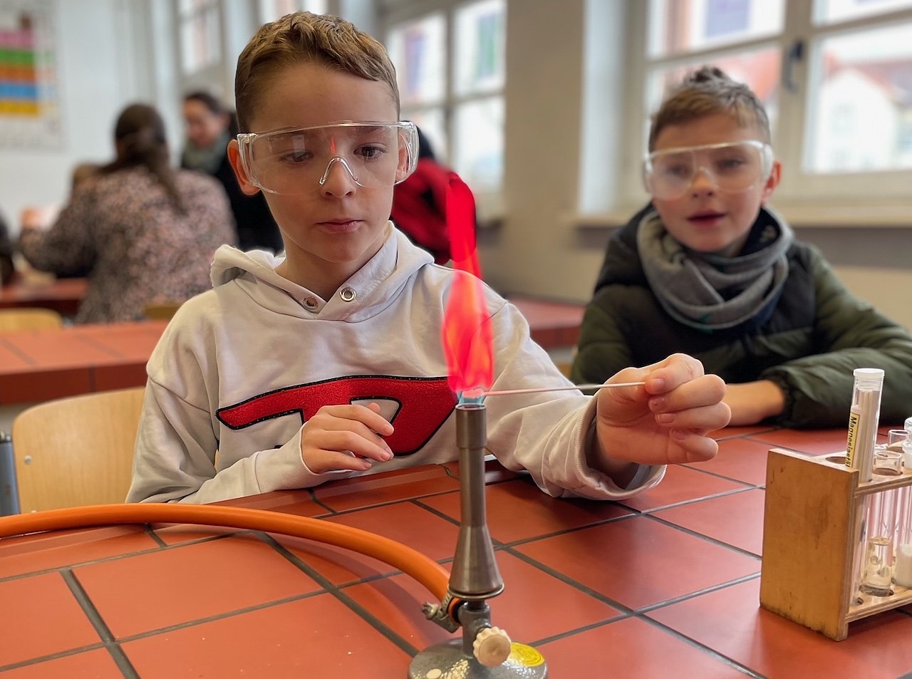 Für großes Staunen sorgten in diesem Jahr die verschiedenen Experimente in Chemie und Physik, bei denen die Kinder von den zwölft Klässlern angeleitet wurden. Wen der kleine Hunger überkam, der konnte sich in einem der zwei Cafés verköstigen lassen. Interessiert zeigten sich die Besucher auch an der Bergschulstatistik, welche unter anderem Auskunft über die durchschnittliche Zeit des Weckerklingelns oder die Art und Weise gibt, wie die Schüler zur Schule kommen. Besonders die Ausfallquote von Unterrichtsstunden, die deutlich unter dem Durchschnitt in Thüringen liegt, beeindruckte.