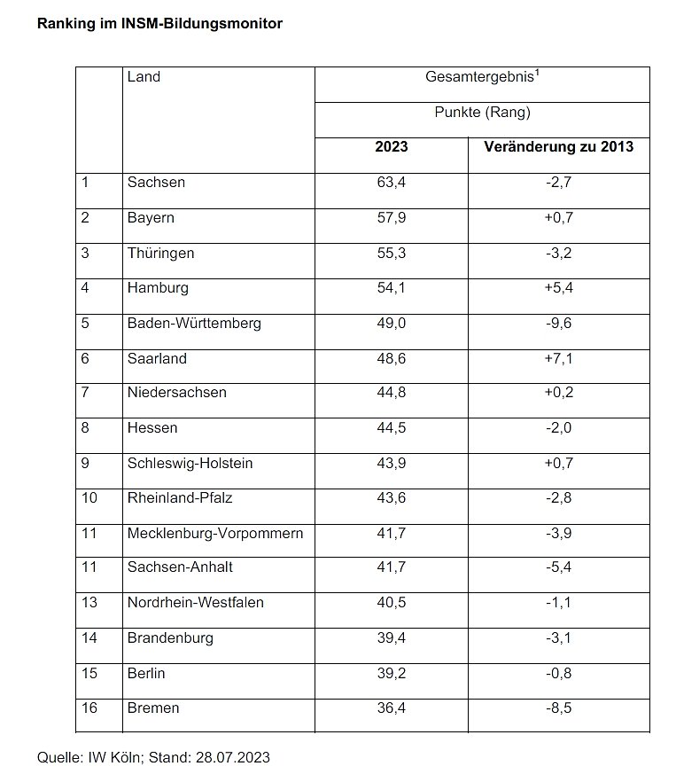 Das Fazit der Studienautoren des Instituts der deutschen Wirtschaft (IW): Auf zehn Jahre Fortschritt folgten zehn Jahre mit steigendem Handlungsdruck. Im aktuellen Ländervergleich schneiden erneut Sachsen, Bayern und Thüringen am besten ab.