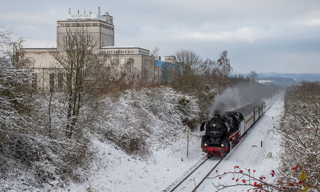 Sein Text zum Foto lautet:Hier eine Aufnahme der 41 1144 der IGE Werrabahn mit einem Sonderzug auf Harzrundfahrt bei der Nordhäuser Tabakfabrik. Der Zug verkehrte am 02. Dezember 2023 von Halberstadt aus einmal rund um den Harz.
